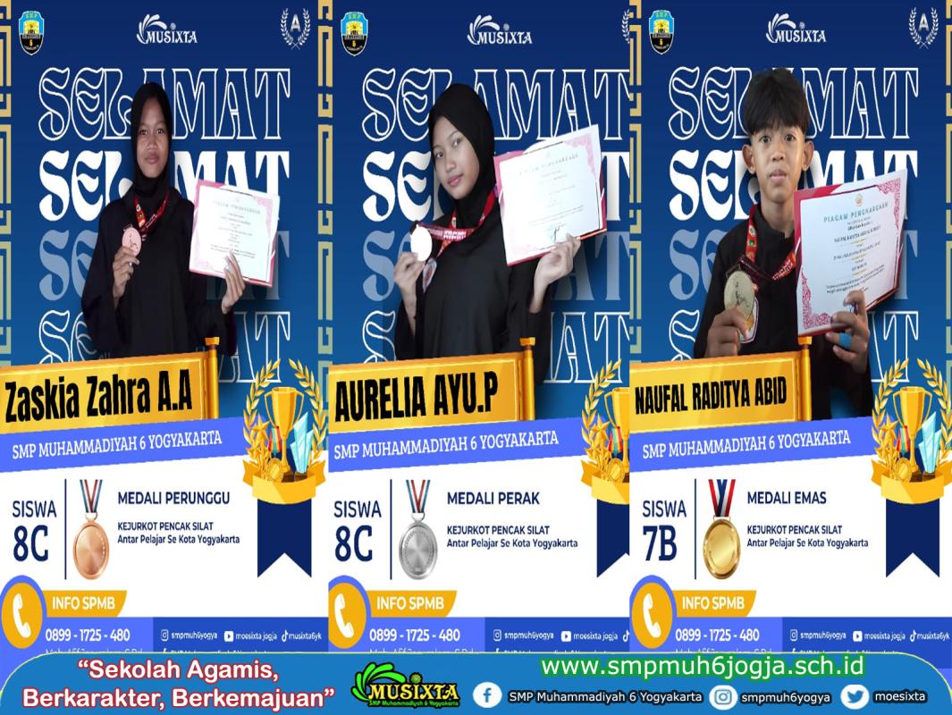 Musixta, Prestasi membanggakan kembali ditorehkan peserta didik SMP Muhammadiyah 6 Yogyakarta. Tidak tanggung-tanggung, 3 Juara direbut yaitu Juara 1, 2 dan 3. Naufal Raditya Abid Al Khalifi, peserta didik kelas 7-B, berhasil meraih Juara 1 (medali emas), Aurelia Ayu Prawesti, peserta didik kelas 8-C, berhasil meraih Juara 2 (medali perak) dan Zaskia Zahra Aulia Aldryna,