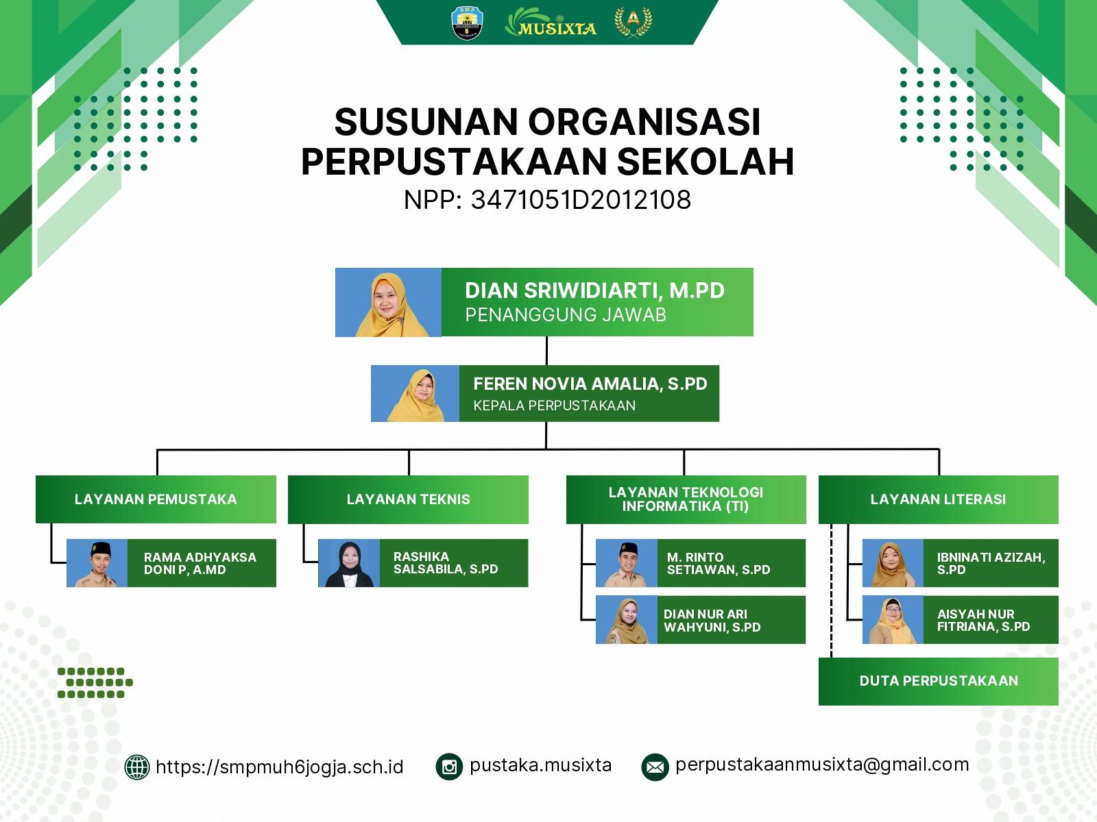 Struktur organisasi perpustakaan Musixta SMP Muhammadiyah 6 Yogyakarta terdiri dari Kepala Sekolah (sebagai penanggung jawab tertinggi), Kepala Perpustakaan (yang memimpin operasional), dan bagian atau staf yang bertugas pada bidang Pemustaka (sirkulasi, referensi), Layanan Teknis (pengadaan, pengolahan), Layanan Teknologi Informasi (TI) dan Layanan Literasi yang dibantu oleh Duta Perpustakaan.